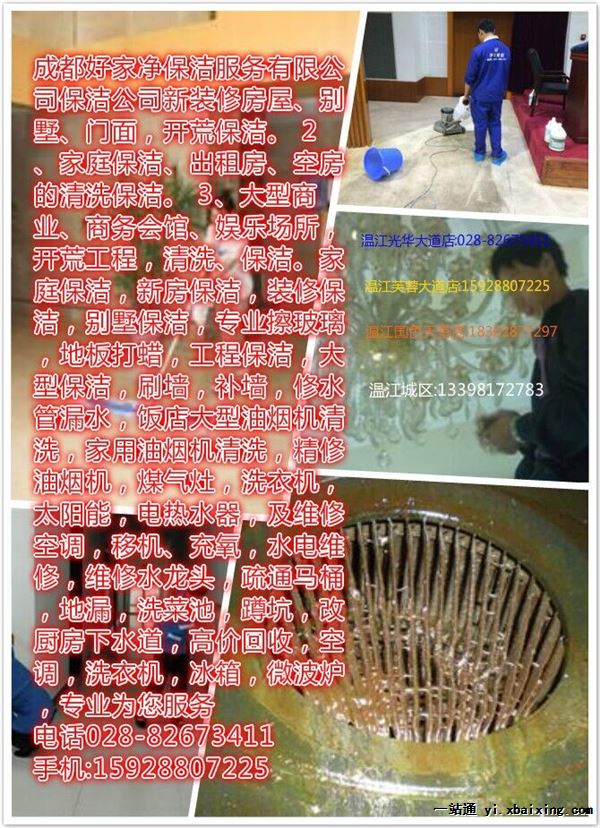 4、外墙清洗:对高层建筑每年定期的外墙清洗; 5,承接室内外粉刷,维修,卫生间,厨房装修,水电维修 6、承接各单位室内,外大中型开荒保洁工程,及长期定点日常保洁服务,卫生间清洗,厨房清洗. 7、管道疏通; 专业疏通各种下水道,地沟,窨井,化粪池疏通,清理,改道. �包天170元。